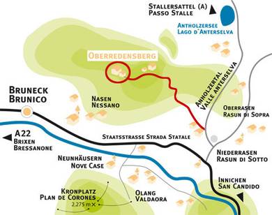 Sobald Sie beim Kreisverkehr am Dorfeingang von Niederrasen angelangt sind, biegen Sie links ab Richtung Antholz. Bleiben Sie auf dieser Strasse ca. 1,5 km und dann biegen Sie links ab. Hier ist bereits unser Hof ausgeschildert (App. Oberredensberg). Noch 1,8 km den Berg hoch und Sie sind an Ihrem Ziel angelangt.